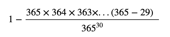 = 1 - 全員の誕生日が異なる確率