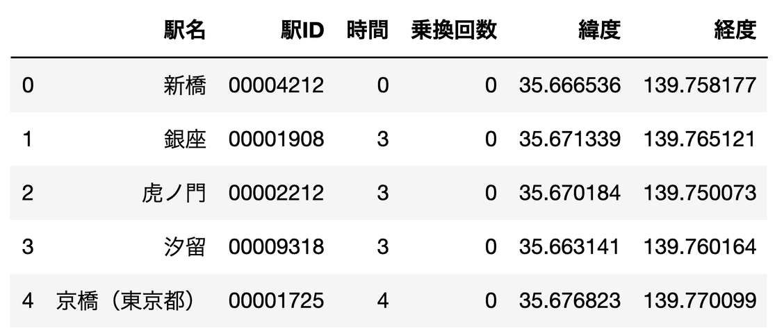 df = pd.DataFrame(data,columns=['駅名','駅ID','時間','乗換回数','緯度','経度'])