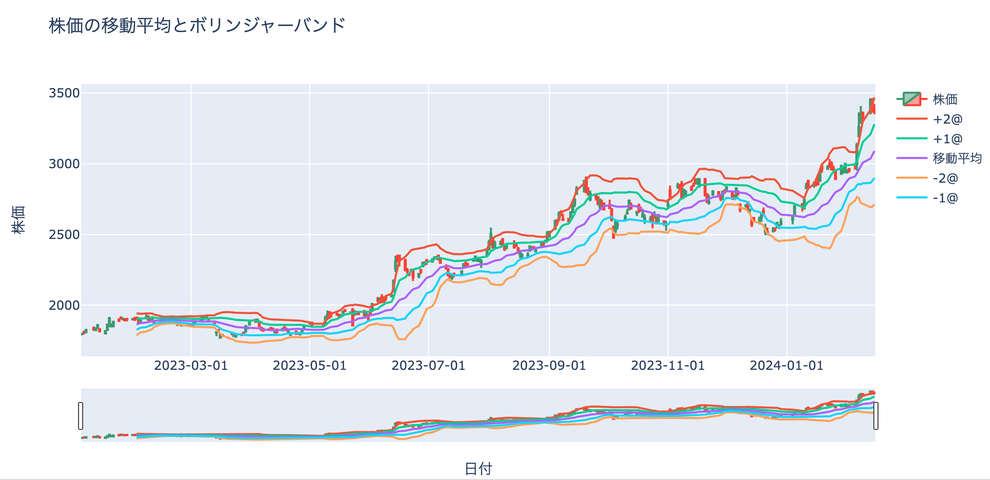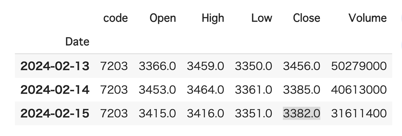 # ライブラリのインポート import os import datetime as dt import pandas_datareader.data as web import plotly.graph_objects as go import pandas as pd # 銘柄コード入力(7203はトヨタ自動車) code = "7203" symbol = code + ".JP" # 2023-01-01以降の株価取得 start , end = '2023-01-01', dt.date.today() #データ取得 df = web.DataReader(symbol, data_source='stooq', start=start,end=end) df.insert(0, "code", code, allow_duplicates=False) df = df.sort_index() df.tail(3)