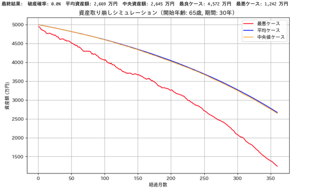 # スライダーUI age_slider = widgets.IntSlider(value=65, min=50, max=100, step=1, description="開始年齢") years_slider = widgets.IntSlider(value=30, min=10, max=50, step=1, description="年数") assets_slider = widgets.IntSlider(value=5000, min=1000, max=20000, step=100, description="資産(万円)") withdraw_slider = widgets.IntSlider(value=20, min=10, max=100, step=1, description="月取崩(万円)") return_slider = widgets.IntSlider(value=4, min=1, max=20, step=1, description="利回り%") risk_slider = widgets.IntSlider(value=1, min=1, max=30, step=1, description="リスク%") # 実行ボタン run_button = widgets.Button(description="シミュレーション実行", button_style="success") run_button.on_click(run_simulation) # UIまとめて表示 ui = widgets.VBox([age_slider, years_slider, assets_slider,withdraw_slider, return_slider, risk_slider,run_button]) display(ui)