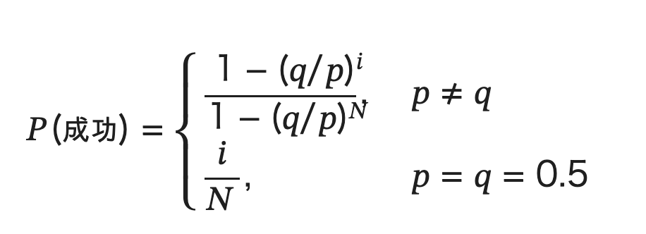 ギャンブラーの破産問題の公式に当てはめると解けるようです。