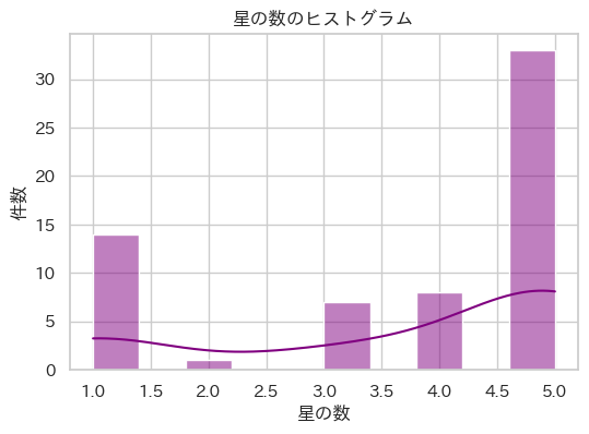 sns.histplot(df["星の数"], bins=10, kde=True, color="purple")