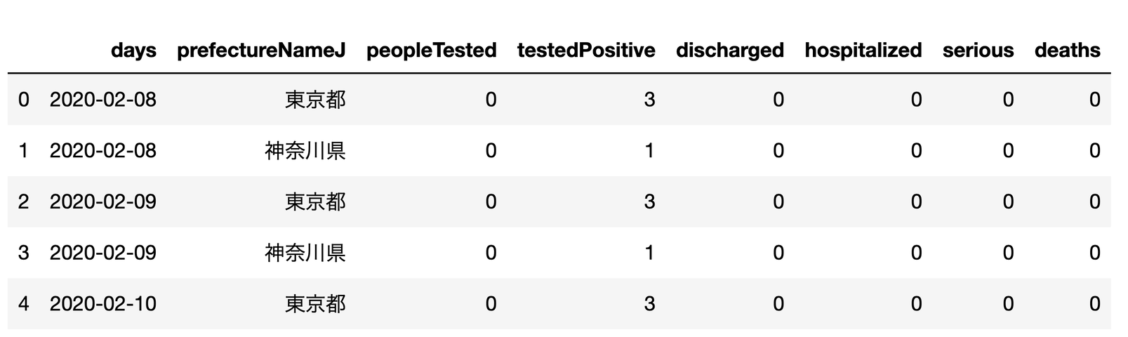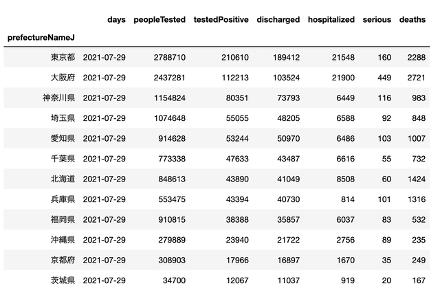 df = df[['days','prefectureNameJ', 'peopleTested', 'testedPositive','discharged', 'hospitalized', 'serious', 'deaths' ]]