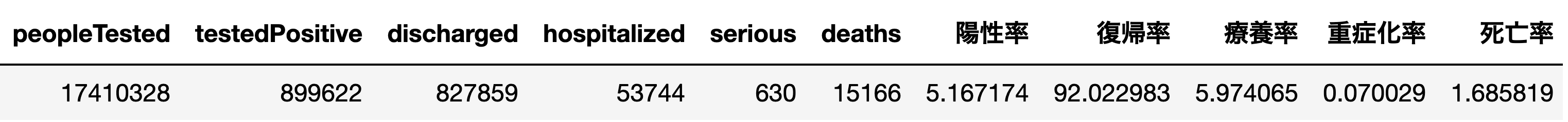 df['陽性率'] = df['testedPositive'] / df['peopleTested'] * 100 df['復帰率'] = df['discharged'] / df['testedPositive'] * 100 df['療養率'] = df['hospitalized'] / df['testedPositive'] * 100 df['重症化率'] = df['serious'] / df['testedPositive'] * 100 df['死亡率'] = df['deaths'] / df['testedPositive'] * 100 days = '2021-07-29' df2 = df[['prefectureNameJ','peopleTested','testedPositive','discharged','hospitalized','serious','deaths','陽性率','復帰率','療養率','重症化率','死亡率']][df['days']==days] df3 = pd.DataFrame(data=df2[['peopleTested','testedPositive','discharged','hospitalized','serious','deaths']].sum()) df3 = df3.T df3['陽性率'] = df3['testedPositive'] / df3['peopleTested'] * 100 df3['復帰率'] = df3['discharged'] / df3['testedPositive'] * 100 df3['療養率'] = df3['hospitalized'] / df3['testedPositive'] * 100 df3['重症化率'] = df3['serious'] / df3['testedPositive'] * 100 df3['死亡率'] = df3['deaths'] / df3['testedPositive'] * 100 df3
