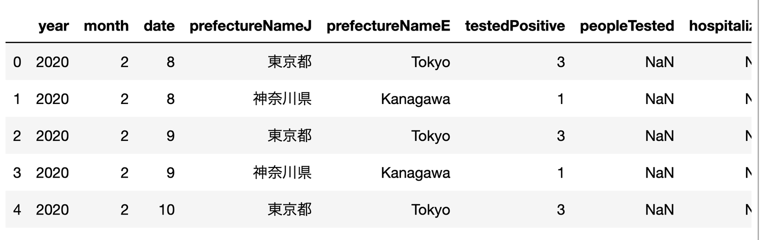 import pandas as pd url = 'https://toyokeizai.net/sp/visual/tko/covid19/csv/prefectures.csv' df = pd.read_csv(url) df.head()