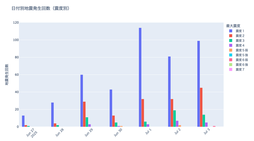 daily_shindo_counts = df.groupby(['日付', '最大震度']).size().reset_index(name='地震回数')