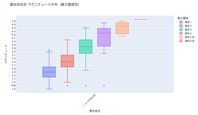 title='震央地名別 マグニチュード分布(最大震度別)',