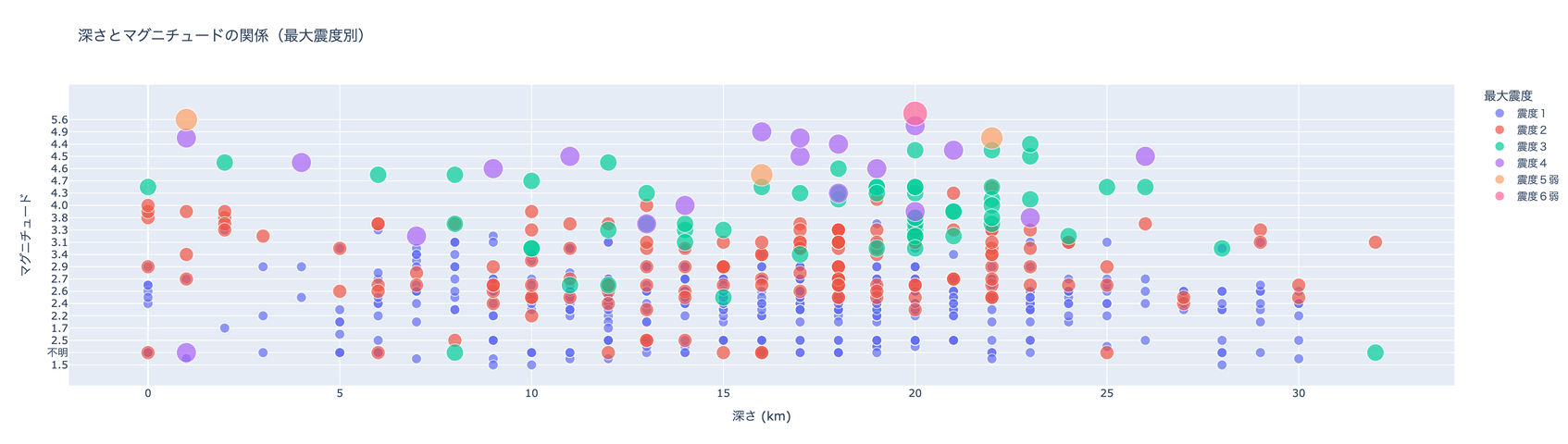 labels={'深さ_数値': '深さ (km)', 'M': 'マグニチュード'},
